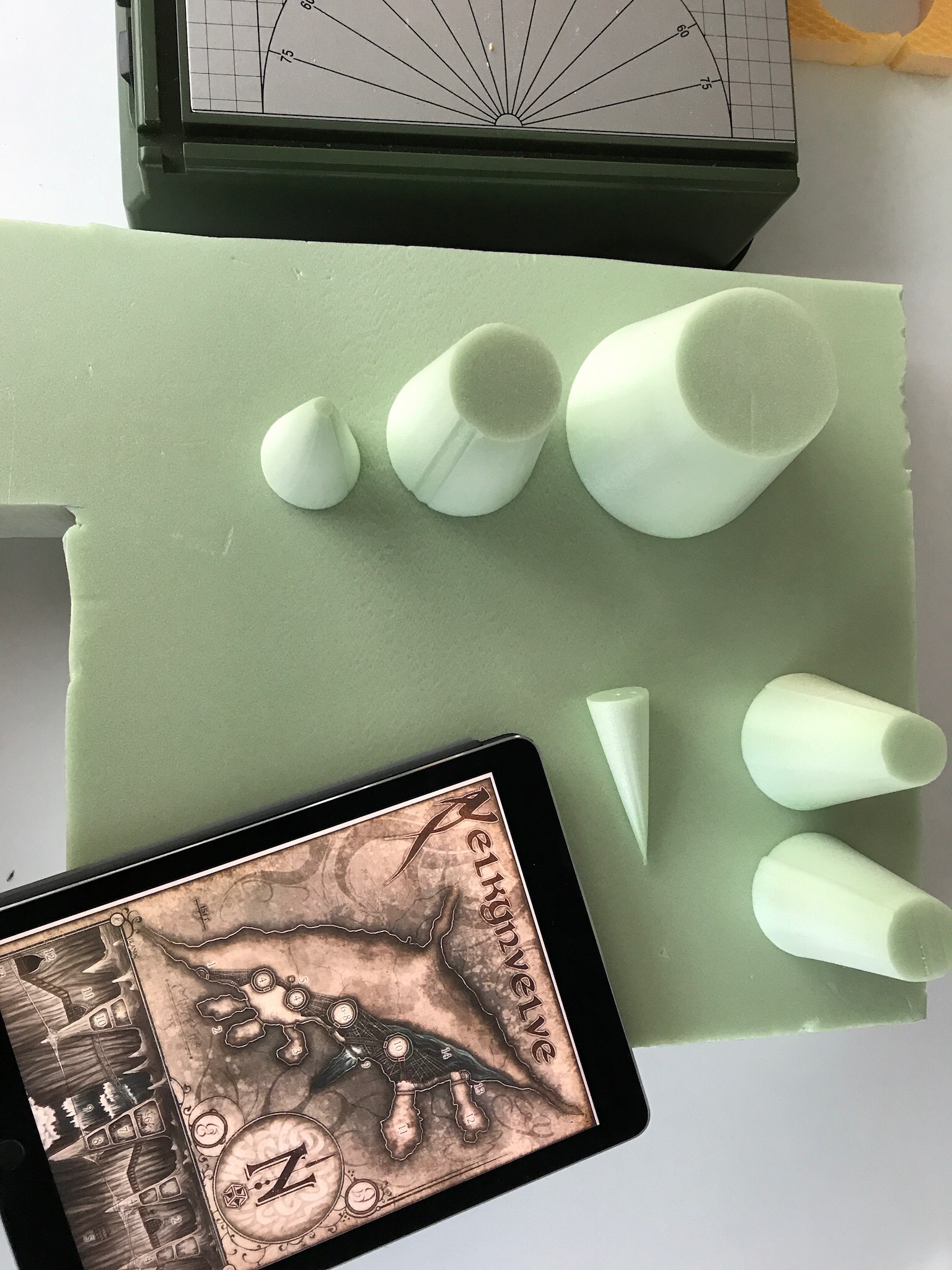 Große Herausforderung war hier, die richtigen Dimensionen zu erfassen; nach ein paar Fehlversuchen war das dann aber doch im Kasten. Vor allem der Turm der Priesterin mit den 3 Ebenen hatte es in sich. Die 8cm Platten habe ich mit dem Proxxon und einem „Rundschneidewerkzeug“ (Eigennachbau von dem Ding, das Gerard Boom vertreibt) in Kegel mit unterschiedlichen Durchmessern geschnitten. Das ist eine Spielerei, da es meist nie so präzise passt wie man sich das wünscht. Aber am Ende hat auch das funktioniert. Dann ging´s darum die Innenteile rauszuschneiden; Selbes Prinzip wie oben.