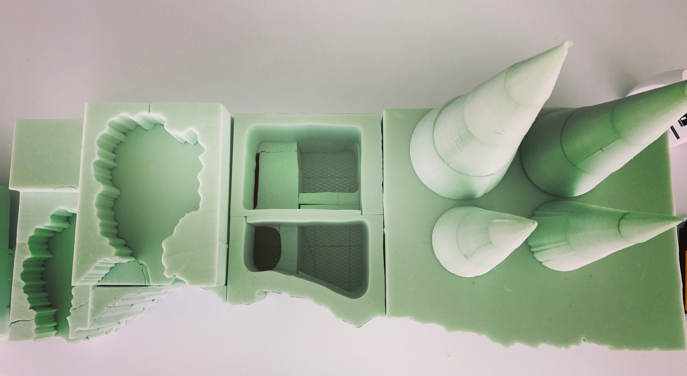 Mit dem Hand-Foam-Schneider begann ich dann die Tiefen heraus zu arbeiten. Dabei war mir wichtig, Abwechslung in die Oberfläche zu bringen. So verformte ich den Draht mehrere Male und bewegte in mal vertikal, mal horizontal in Wellenbewegungen durch das XPS. Am Ende muss jeder für sich herausfinden was gefällt.
